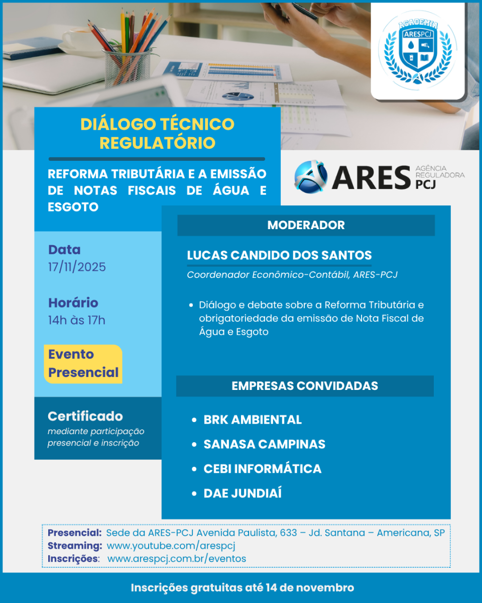 A Academia ARES-PCJ convida para o Diálogo Técnico-Regulatório: Reforma Tributária e a Emissão de Notas Fiscais de Água e Esgotamento Sanitário.