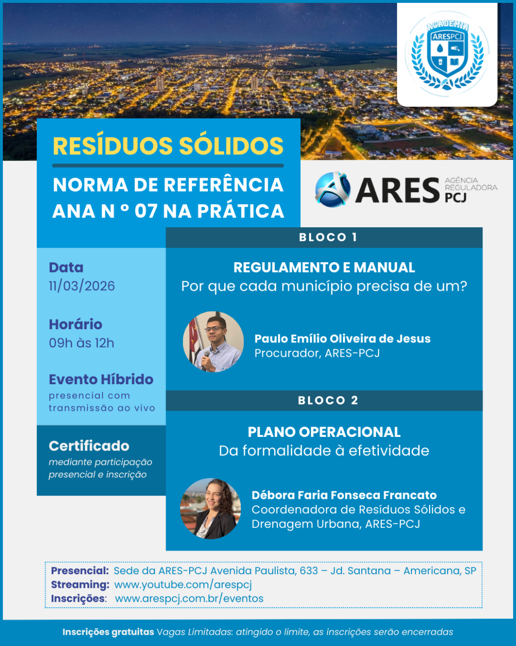 A Academia ARES-PCJ promoverá o evento “RESÍDUOS SÓLIDOS: NR 7 da ANA na prática”, no dia 11/03/2026, na Sede da ARES-PCJ.