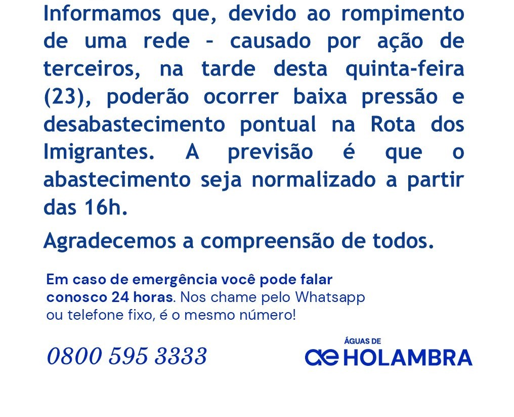 Comunicados / Águas de Holambra - Interrupção Emergencial Águas de Holambra - Interrupção Emergencial Filtrar por cidade: Selecione Americana Amparo Analândia Araçoiaba da Serra Araraquara Araras ARES PCJ Artur Nogueira Atibaia Barretos Barrinha Bom Jesus dos Perdões Brodowski Brotas Campinas Capivari Catanduva Cerquilho Conchal Cordeirópolis Corumbataí Cosmópolis Dobrada Dois Córregos Dumont Engenheiro Coelho Franca Guaíra Holambra Hortolândia Ibaté Indaiatuba Ipeúna Iracemápolis Itapira Itirapina Itu Jaboticabal Jaguariúna Jumirim Jundiaí Leme Limeira Lindóia Louveira Luiz Antônio Macaubal Matão Mogi das Cruzes Mogi Guaçu Mogi Mirim Monte Alegre do Sul Nova Odessa Olímpia Orlândia Paraibuna Pedreira Piracicaba Pirassununga Porto Feliz Rafard Ribeirão Preto Rio Claro Rio das Pedras Salto Santa Bárbara D'Oeste Santa Cruz da Conceição Santa Cruz das Palmeiras Santa Rita do Passa Quatro Santo Antônio de Posse São Carlos São José do Rio Pardo São José do Rio Preto São Pedro São Simão Serrana Sertãozinho Sorocaba Sumaré Tambaú Tietê Valinhos Vargem Grande do Sul Vinhedo Votorantim 23/01/2025 - Holambra