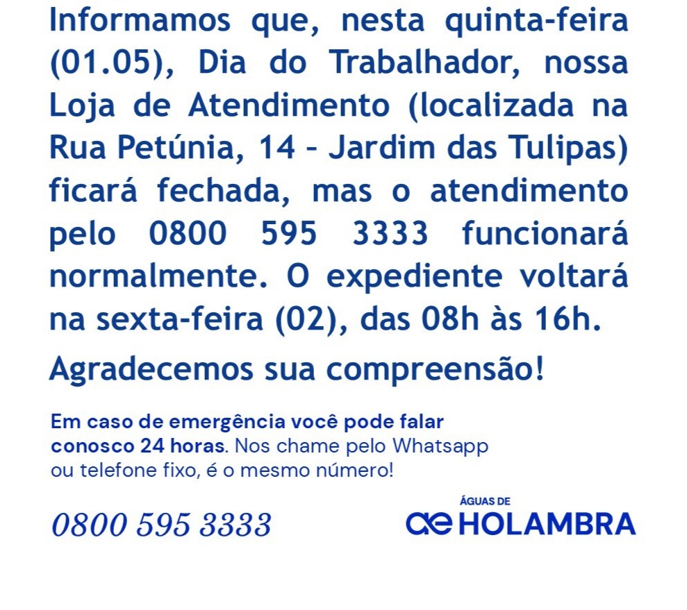 Comunicados / Águas de Holambra - Interrupção Emergencial Águas de Holambra - Interrupção Emergencial Filtrar por cidade: Selecione Americana Amparo Analândia Araçoiaba da Serra Araraquara Araras ARES PCJ Artur Nogueira Atibaia Barretos Barrinha Bom Jesus dos Perdões Brodowski Brotas Campinas Capivari Catanduva Cerquilho Conchal Cordeirópolis Corumbataí Cosmópolis Dobrada Dois Córregos Dumont Engenheiro Coelho Franca Guaíra Holambra Hortolândia Ibaté Indaiatuba Ipeúna Iracemápolis Itapira Itirapina Itu Jaboticabal Jaguariúna Jumirim Jundiaí Leme Limeira Lindóia Louveira Luiz Antônio Macaubal Matão Mogi das Cruzes Mogi Guaçu Mogi Mirim Monte Alegre do Sul Nova Odessa Olímpia Orlândia Paraibuna Pedreira Piracicaba Pirassununga Porto Feliz Rafard Ribeirão Preto Rio Claro Rio das Pedras Salto Santa Bárbara D'Oeste Santa Cruz da Conceição Santa Cruz das Palmeiras Santa Rita do Passa Quatro Santo Antônio de Posse São Carlos São José do Rio Pardo São José do Rio Preto São Pedro São Simão Serrana Sertãozinho Sorocaba Sumaré Tambaú Tietê Valinhos Vargem Grande do Sul Vinhedo Votorantim 06/05/2025 - Holambra