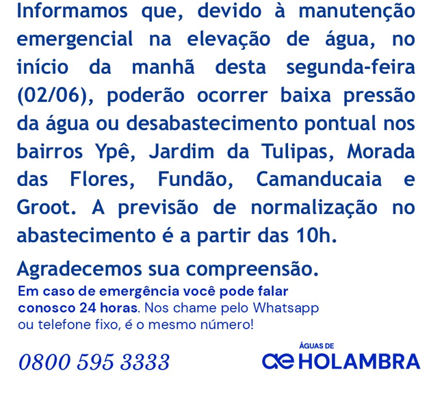 Comunicados / Águas de Holambra - Interrupção Emergencial Águas de Holambra - Interrupção Emergencial Filtrar por cidade: Selecione Americana Amparo Analândia Araçoiaba da Serra Araraquara Araras ARES PCJ Artur Nogueira Atibaia Barretos Barrinha Bom Jesus dos Perdões Brodowski Brotas Campinas Capivari Catanduva Cerquilho Conchal Cordeirópolis Corumbataí Cosmópolis Dobrada Dois Córregos Dumont Engenheiro Coelho Franca Guaíra Holambra Hortolândia Ibaté Indaiatuba Ipeúna Iracemápolis Itapira Itirapina Itu Jaboticabal Jaguariúna Jumirim Jundiaí Leme Limeira Lindóia Louveira Luiz Antônio Macaubal Matão Mogi das Cruzes Mogi Guaçu Mogi Mirim Monte Alegre do Sul Nova Odessa Olímpia Orlândia Paraibuna Pedreira Piracicaba Pirassununga Porto Feliz Rafard Ribeirão Preto Rio Claro Rio das Pedras Salto Santa Bárbara D'Oeste Santa Cruz da Conceição Santa Cruz das Palmeiras Santa Rita do Passa Quatro Santo Antônio de Posse São Carlos São José do Rio Pardo São José do Rio Preto São Pedro São Simão Serrana Sertãozinho Sorocaba Sumaré Tambaú Tietê Valinhos Vargem Grande do Sul Vinhedo Votorantim 02/06/2025 - Holambra