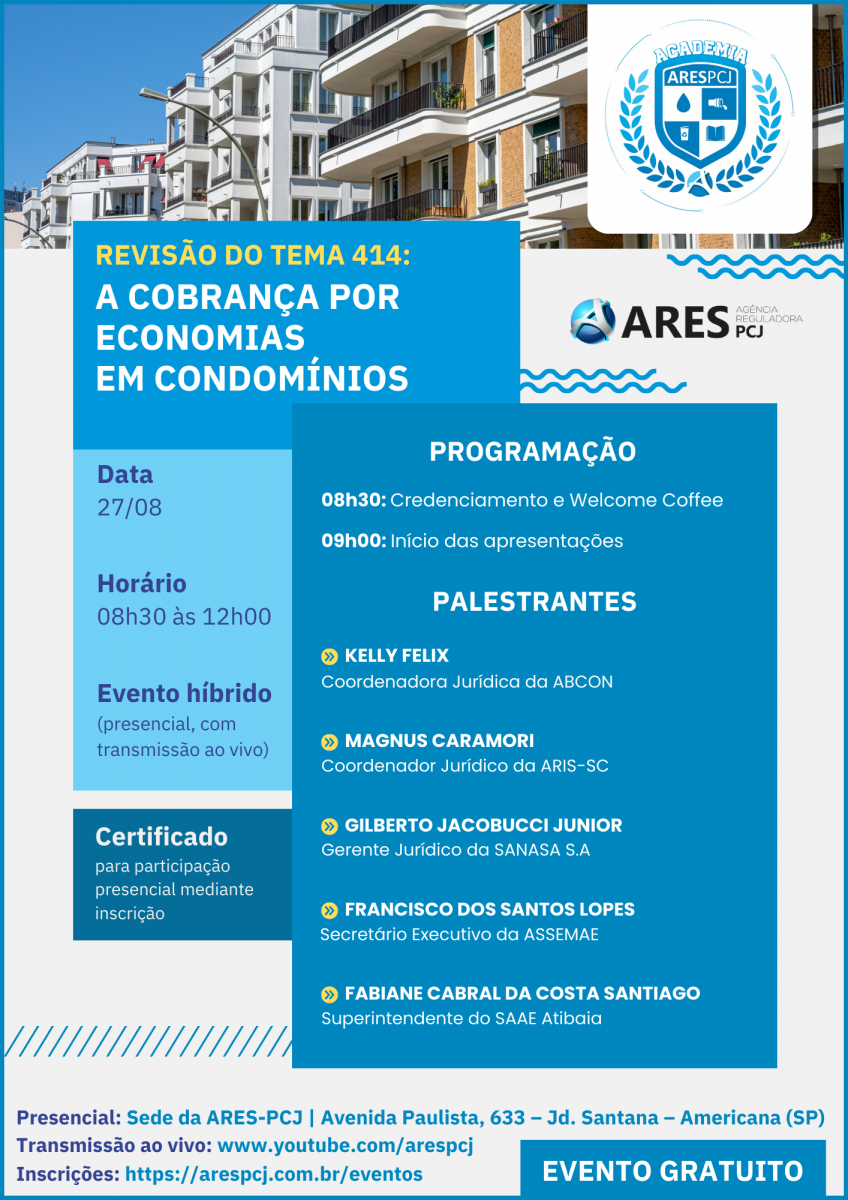 Com grande satisfação, informamos que o próximo evento promovido pela Academia ARES-PCJ para 2024 ocorrerá no próximo dia 27 de Agosto e terá como assunto a ‘Revisão do Tema 414: A cobrança por economias em condomínios’.