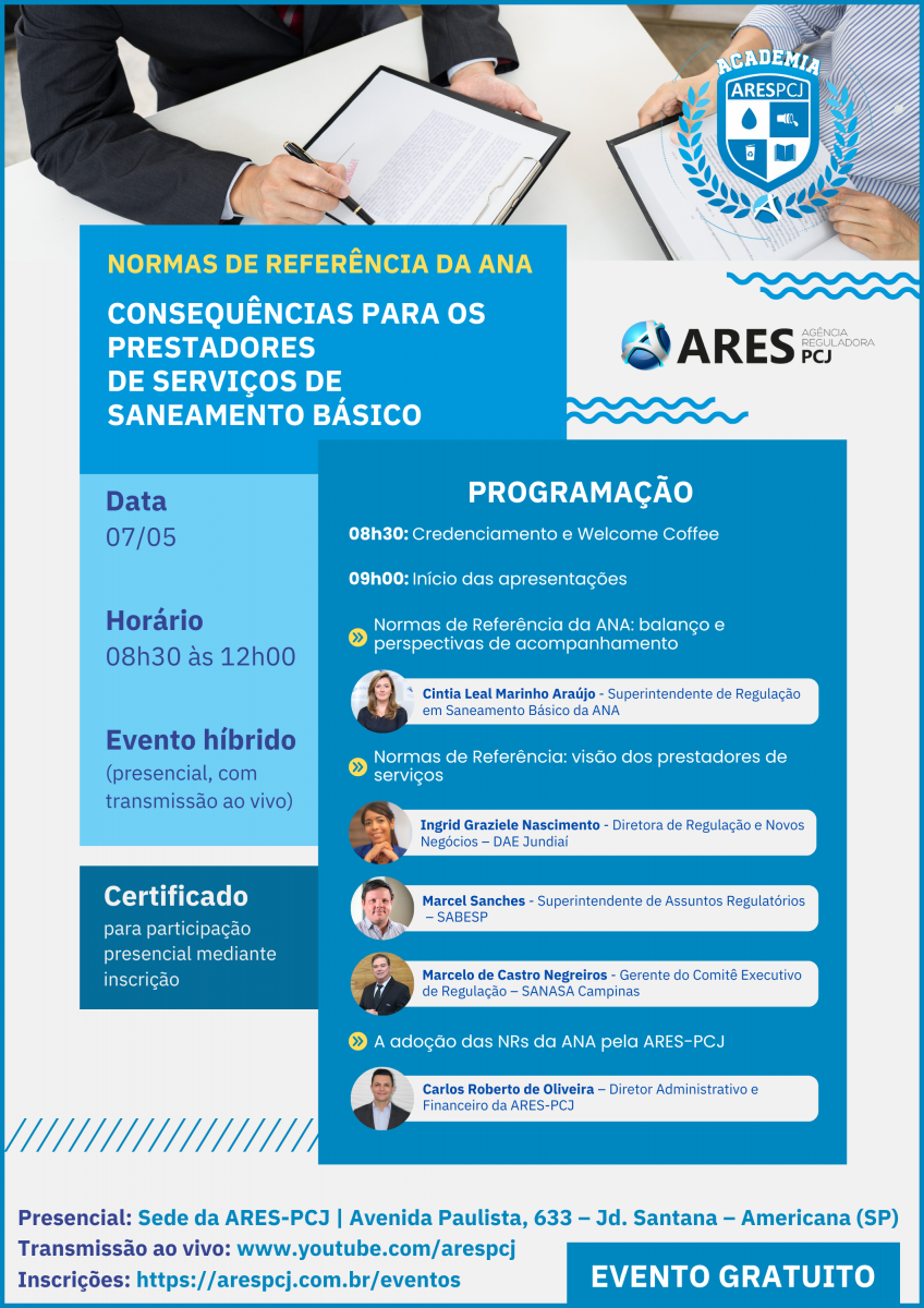 A Academia ARES-PCJ realizará no dia 07 de maio, das 8h30 às 12h00, o evento “Normas de Referência da ANA: consequências para os prestadores de serviços de saneamento básico”.