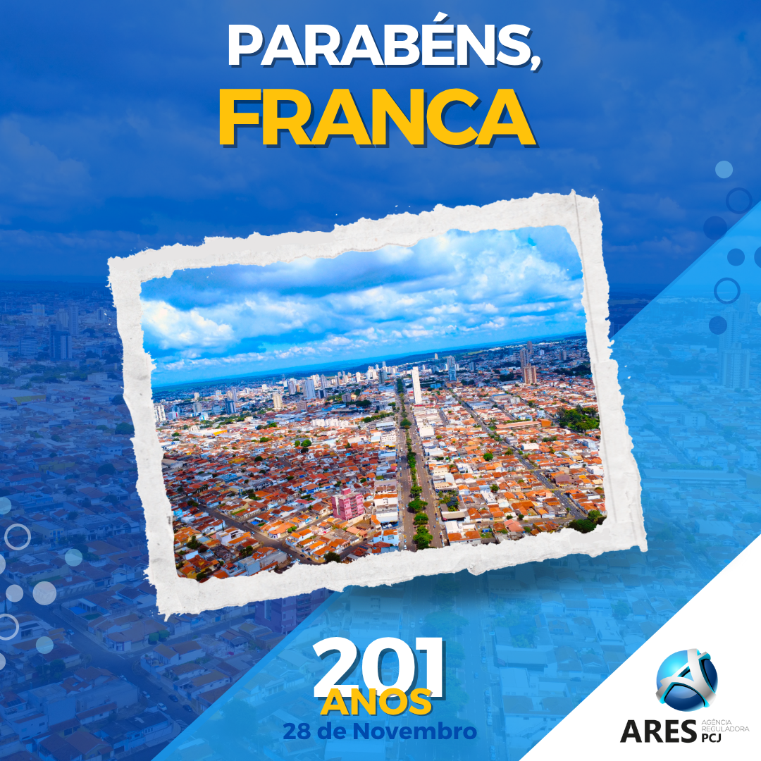 A Agência Reguladora ARES-PCJ parabeniza a cidade de Franca pelos seus 201 anos de fundação! O município, que comemora seu aniversário em 28 de novembro, associou-se à ARES-PCJ em 2023. Por meio de um convênio de cooperação, a ARES-PCJ regula os serviços de manejo de resíduos sólidos urbanos na cidade, prestados pela Secretaria do Meio Ambiente.