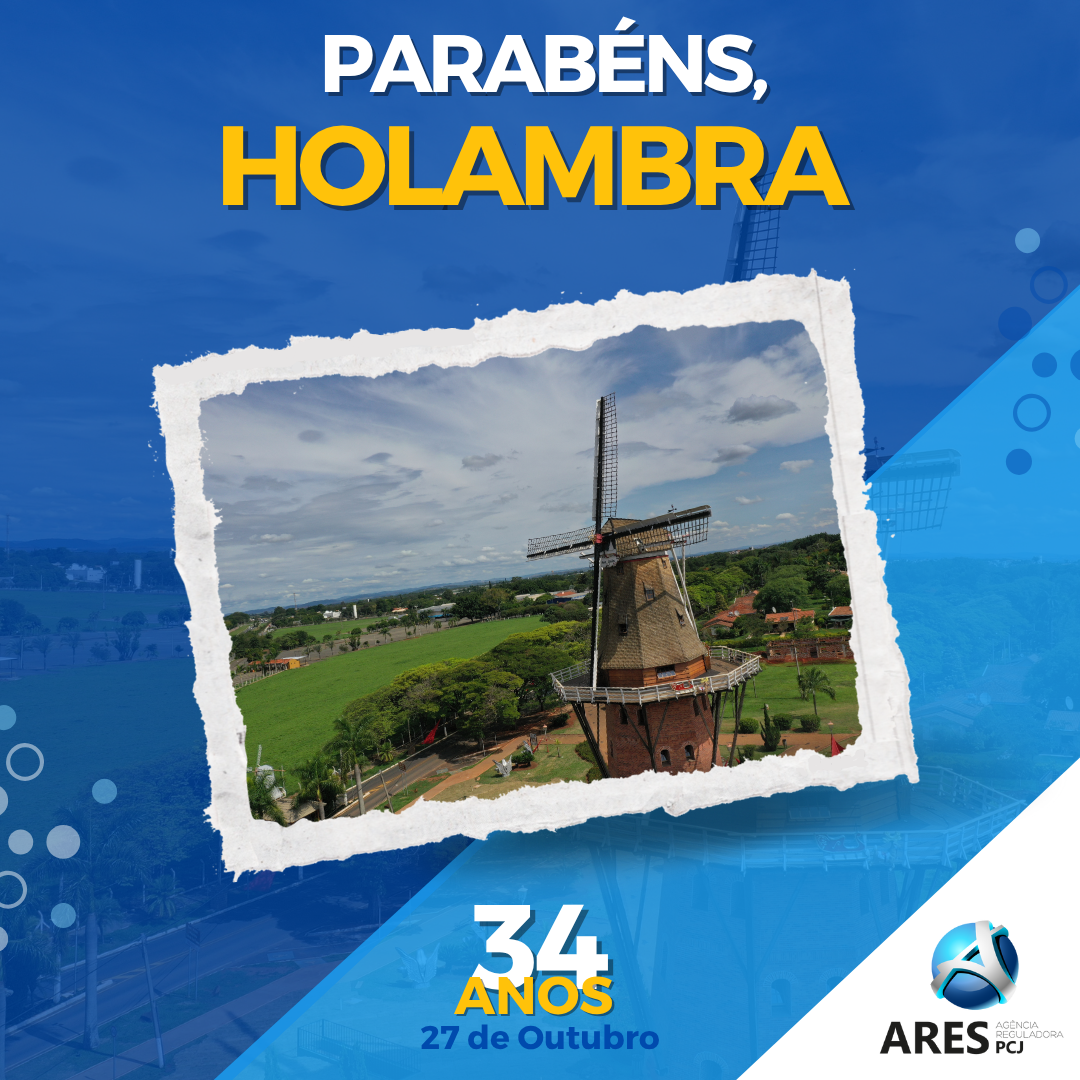 A Agência Reguladora ARES-PCJ parabeniza a cidade de Holambra pelos seus 34 anos de emancipação político-administrativa! O município, que comemora seu aniversário em 27 de outubro, é associado à ARES-PCJ desde 2015, tendo os serviços de saneamento básico prestados pela concessionária Águas de Holambra.